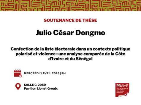 Événements à venir Soutenance de thèse – Julio César Dongmo1 avril 2026 • 9h Pavillon Lionel-Groulx 23 mars 2026 Ce contenu a été mis à jour le 23 mars 2026 à 10h40.